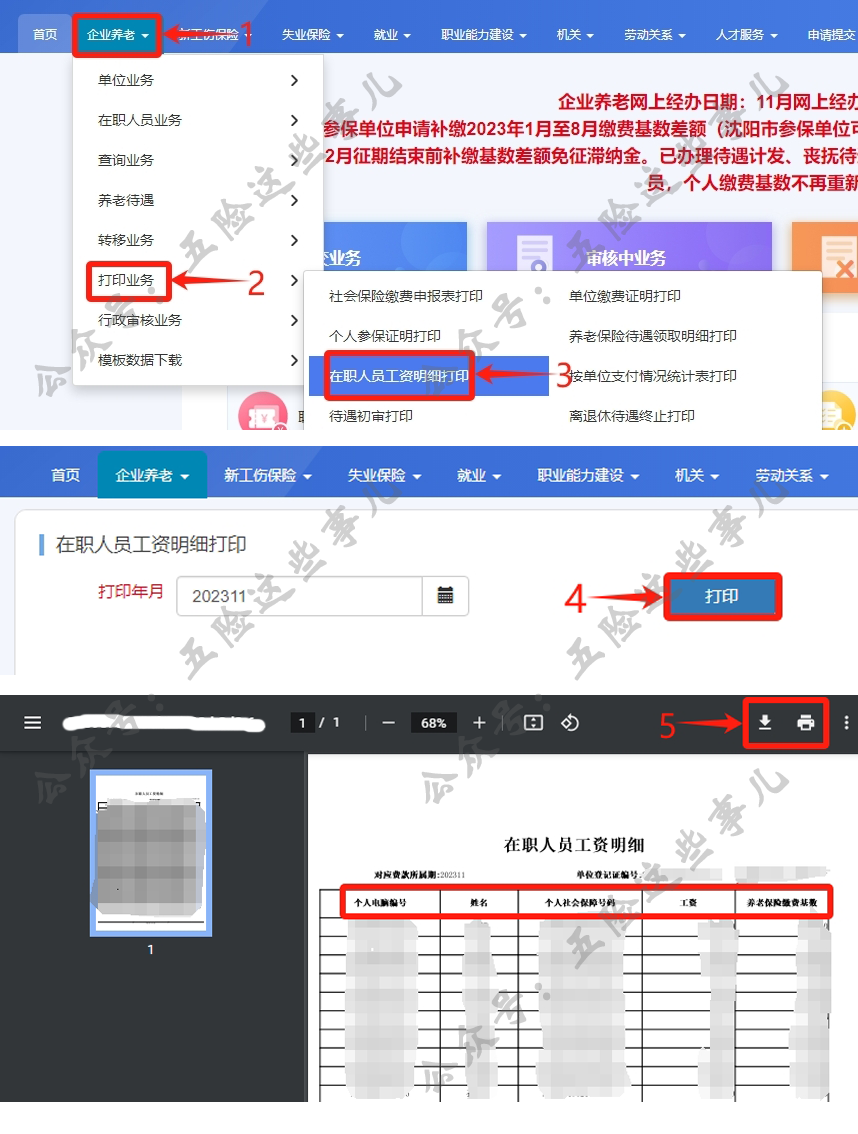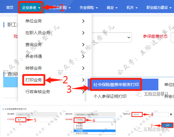 2、所有員工的基數準确無誤。核對員工養老保險、工傷保險基數方法:點擊“企業養老”→“打印業務”→“在職人員工資明細打印”→“打印”,可以查看、下載、打印個人編号、姓名、工資、繳費基數等信息(失業保險基數在失業保險菜單内核對,具體流程參照以上方法),核對無誤後可進行單位應收核定。