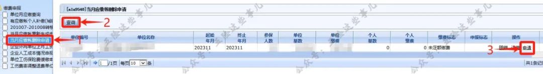 1、如果發現人數錯誤,需要點擊“當月應繳賬删除申請”→“查詢”→“申請”,等待後台審核通過後進行人員變動,變動完成(chéng)并審核通過後重新進行應繳賬重新生成(chéng)申請。