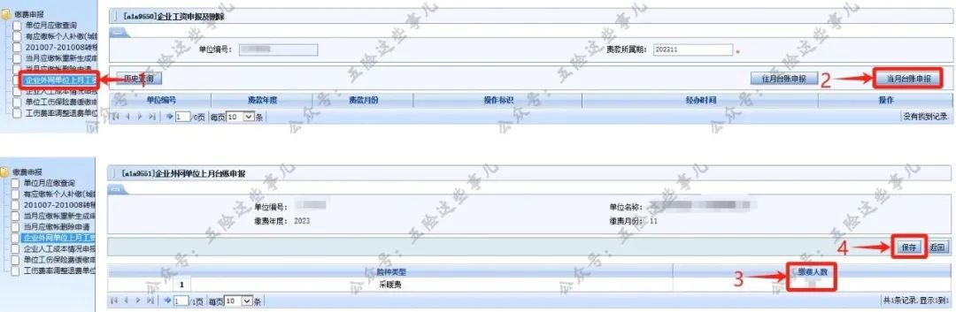 審核通過後,點擊“企業外網單位上月工資申報”→“當月台賬申報”,認真核對采暖費繳費人數。