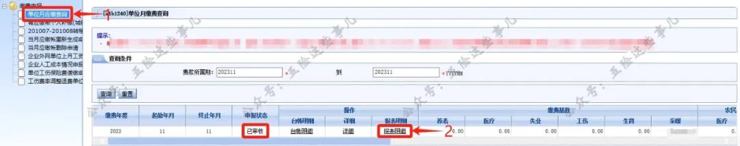 随後,可點擊“單位月應繳查詢”查看審核狀态,點擊“報表明細”可查看、打印賬單。