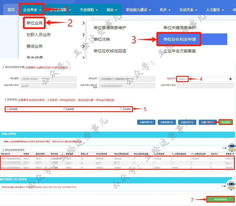 核定流程:點擊“企業養老”→“單位業務”→“單位應收核定申請”→選擇“核定年月”(核定年月默認爲單位近一次繳費月份的次月,可手動改爲需要核定的月份)→勾選“養老保險、失業保險、工傷保險”(如果沒有失業保險,可單獨在失業保險菜單内進行核定,具體流程參照以上方法)→點擊“核定預覽”,在預覽結果内可核對人數、金額等繳費信息。核對無誤後點擊“單位應收核定”,之後回到首頁→待提交業務→勾選→批量提交後,等待後台審核即可。