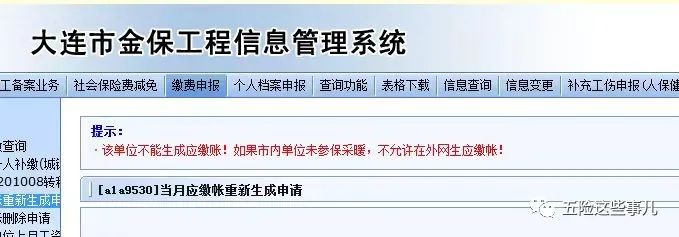由于工傷保險轉移至省系統,金保系統隻操作采暖費,因此,市内五區、原金州、旅順各類企業、民辦非企業(個體工商戶除外)需要爲大連市内戶口職工(市内五區、原金州、旅順居民戶口人員)繳納采暖費,要在金保系統操作生賬。非上述企業以及個體工商戶等無需繳納采暖費,在生賬時會出現類似以下錯誤提示: